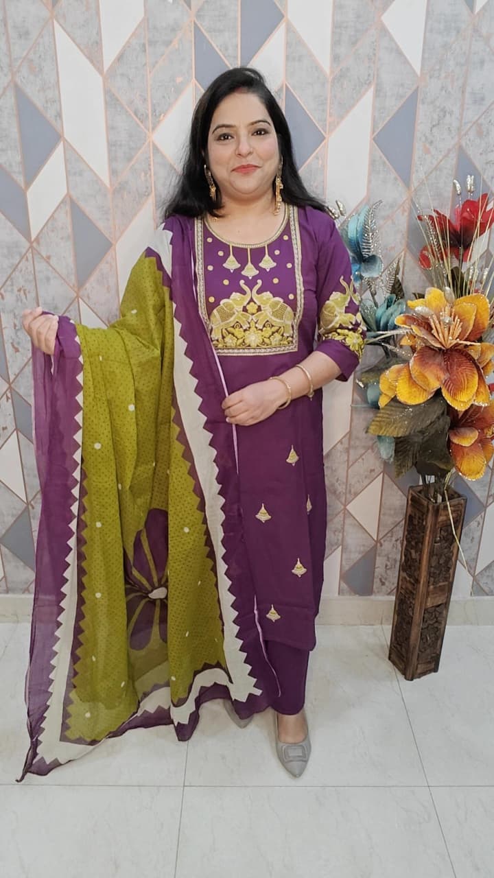 Beautiful Designer Cotton Suit with Embroidery Purple Color